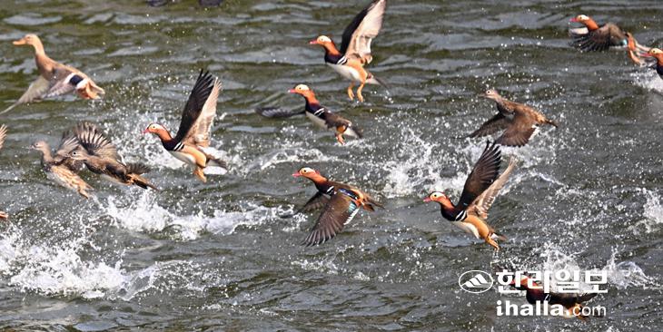 [한라일보] 겨울을 보내기 위해 제주를 찾은 천연기념물 원앙 100여 마리가 27일 제주시 오라동 한 골프장 연못에서 인기척에 놀란 듯 한꺼번에 날아 오르고 있다. 강희만기자