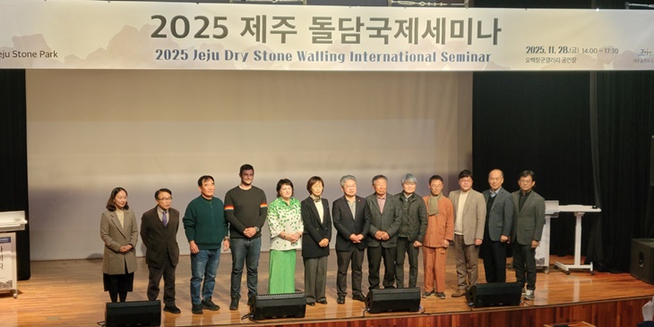 | 지난 28일 제주시 조천읍 제주돌문화공원 오백장군갤러리 공연장에서 열린 '2025 제주 돌담국제세미나'에서 참석자들이 기념촬영을 하고 있다. 박소정기자 |
