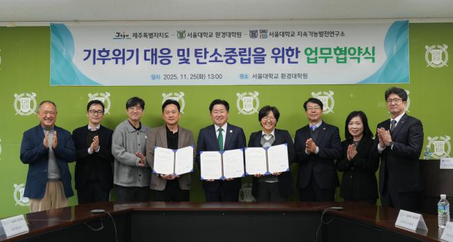 제주도는 지난 25일 오전 서울대학교에서 서울대 환경대학원, 지속가능발전연구소와 '기후위기 대응 및 탄소중립을 위한 지속가능 정책 연구·자문 및 교류 업무협약'을 체결했다.