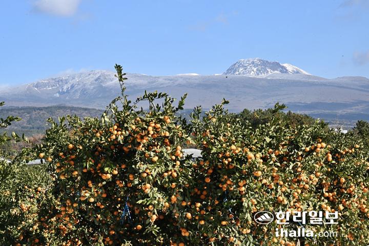 [한라일보] 반짝 추위로 한라산에 눈이 내리면서 5일 하얀 백록담과 노랗게 익어가는 감귤과 대조를 이루며 이국적인 풍경을 연출하고 있다. 서귀포 중문에서 강희만 기자