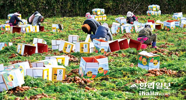 [한라일보] 16일 서귀포시 표선면 성읍리 한 농경지에서 농민들이 당근을 수확하고 있다. 강희만기자