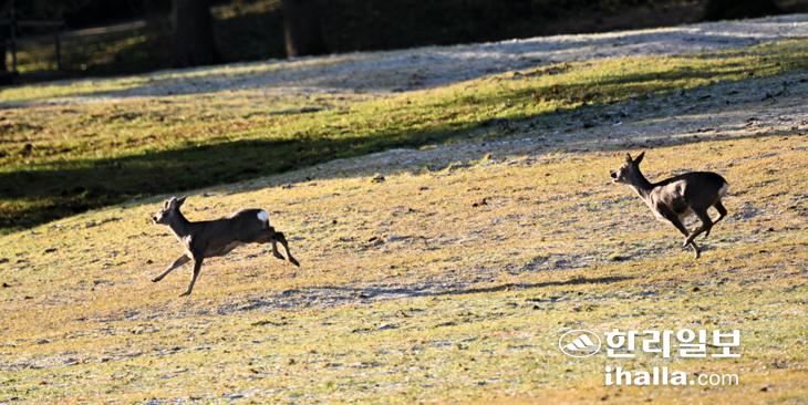 [한라일보] 17일 제주시 용강동 제주마방목장에서 노루 두 마리가 힘차게 뛰어가고 있다. 강희만기자