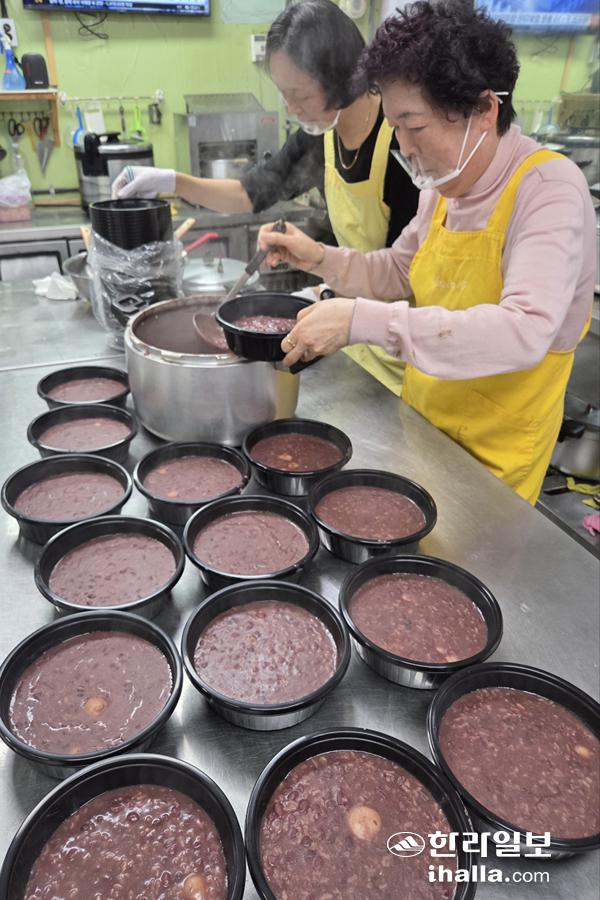 [한라일보] 절기상 동지(冬至)를 하루 앞둔 21일 제주시 화북동 종합시장 내 한 가게에서 손님들이 주문한 팥죽 포장작업이 이뤄지고 있다. 강희만기자