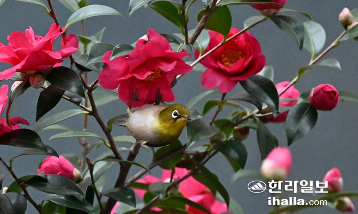 [한라일보] 21일 제주시 노형동 한 아파트 화단에 활짝 핀 애기동백꽃에 동박새 한마리가 날아와 앉아 있다. 강희만기자