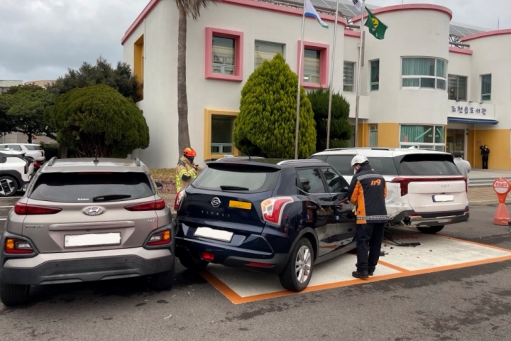 24일 제주소방안전본부와 제주동부경찰서에 따르면 이날 오후 1시 43분쯤 제주시 조천읍 조천도서관 앞에서 소형 스포츠유틸리티차(SUV) 1대가 돌진해 또 다른 차량 2대와 부딪히는 사고가 발생했다.