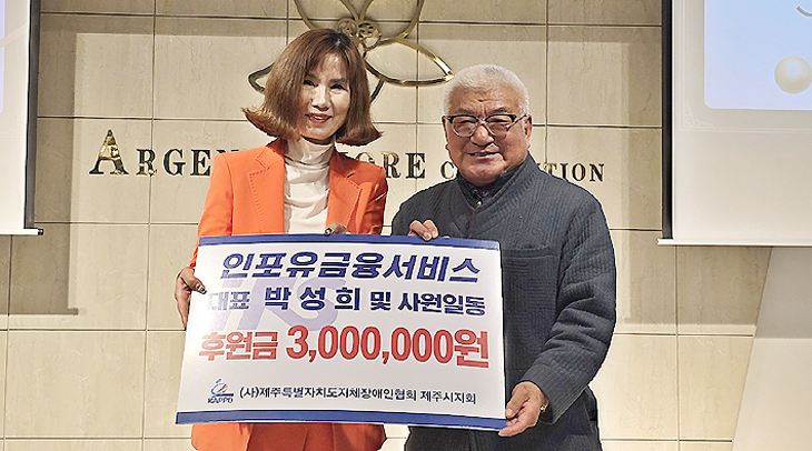 인포유금융서비스(대표 박성희)는 지난 26일 '2025 송년의 밤 인포유금융서비스 연말대상'에서 도지체장애인협회 제주시지회(지회장 오형범)에 300만원을 후원했다.