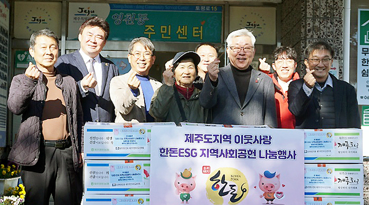 대한한돈협회 제주특별자치도협의회(회장 김재우)는 최근 영천동주민센터에서 제주사회복지공동모금회(회장 강지언)에 한돈 400㎏을 기탁했다.