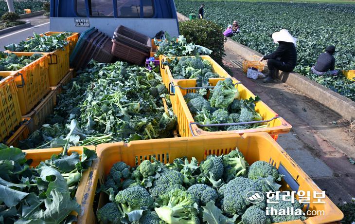 [한라일보] 29일 제주시 한경면 고산리 한 농경지에서 브로콜리 수확 작업이 이뤄지고 있다. 강희만기자