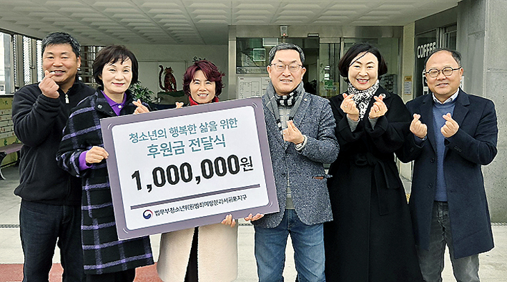 법무부 청소년범죄예방위원 제주지역협의회 범죄예방분과 위원회(위원장 박남규) 서귀포지구(회장 김형준)는 최근 서귀포시 장애인회관에서 청소년의 행복한 삶을 위한 후원금 100만원을 전달하며 따뜻한 나눔을 실천했다.