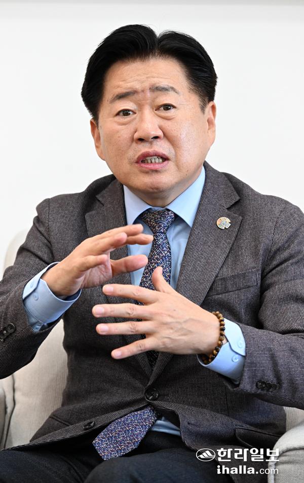 오영훈 지사가 한라일보와의 신년 인터뷰에서 제주 지역 주요 현안에 대한 입장을 밝히고 있다. 강희만기자