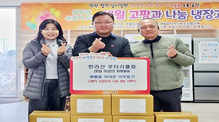 한라산로타리클럽(회장 이성민)은 지난달 27일 애월읍사무소(읍장 김태헌)를 방문해 직접 담근 김장김치 5㎏ 14박스를 전달했다.