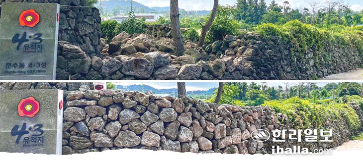 제주시 한림읍 동명리 문수동에 허물어진 4·3성담. 지난해부터 이 곳에선 무너진 성담에 돌을 다시 쌓아 복원하는 작업이 이뤄지고 있다. 돌빛나예술학교 제공