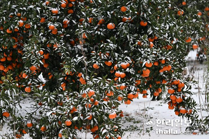 [한라일보] 2일 새벽부터 제주전역에 대설주의보가 내려지면서 많은 눈이 내리자 아직 수확하지 못한 노란 감귤과 하얀 눈의 조화가 한편 수채화를 만들어내고 있다. 제주시 아라동에서 강희만 기자
