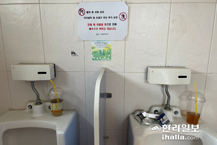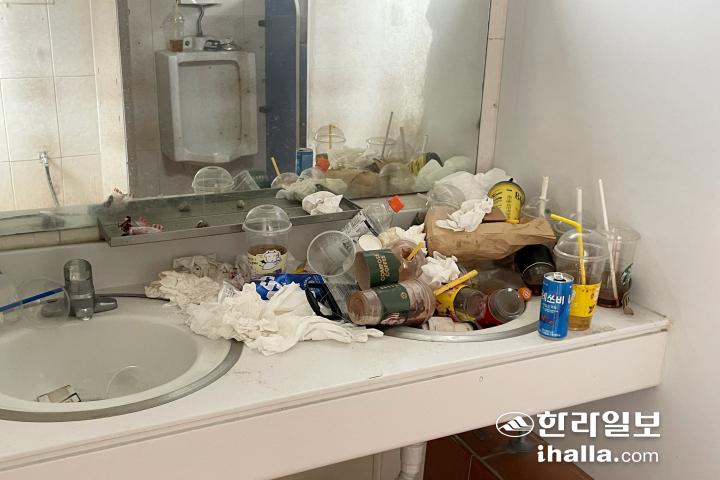 일회용 플라스틱컵에서부터 맥주캔, 음료병, 담뱃갑, 쓰고 버린 휴지 뭉치 등이 세면대와 소변기를 뒤덮었다. 오랜 기간 관리가 이뤄지지 않으면서 미세한 악취와 함께 내부 거울이 거뭇하게 변하는 등 방치돼 있었다.