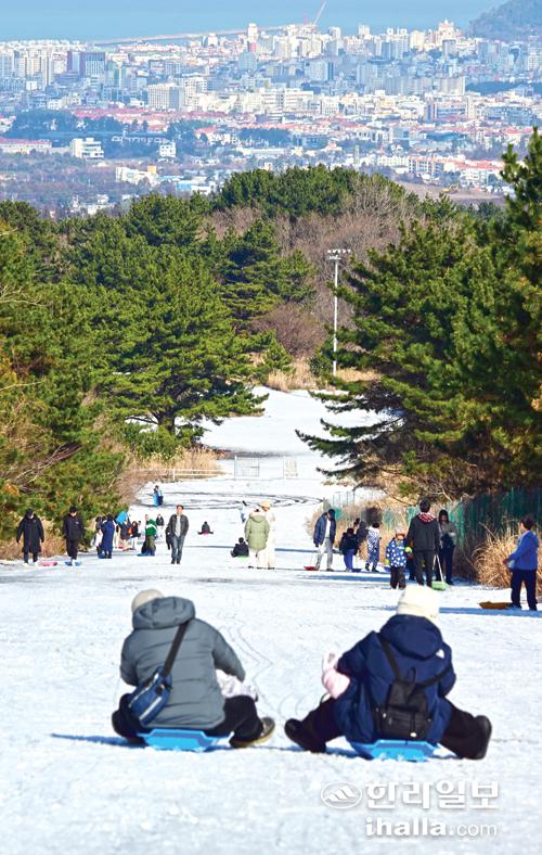 [한라일보] 12일 제주시 오라동 오라관광단지 개발사업 부지 진입로에서 시민들이 눈썰매를 타고 있다. 강희만기자