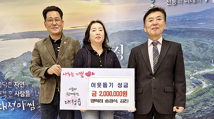 서귀포시 대정읍 영락리 송경석·김진 부부는 지난 8일 대정읍사무소를 방문해 지역 내 어려운 이웃들을 위해 사용해달라며 성금 200만원을 기탁했다.