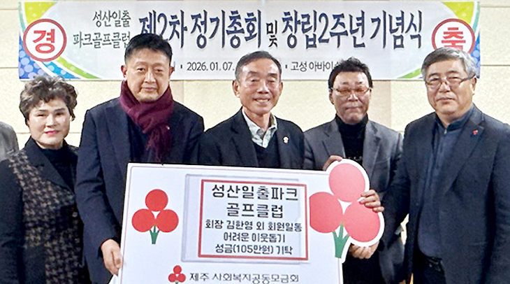 서귀포시 성산일출파크골프클럽(회장 김한영)은 지난 7일 열린 제2차 정기총회 및 창립 2주년 기념식 행사에서 어려운 이웃을 위한 성금 105만원을 성산읍에 기탁했다.