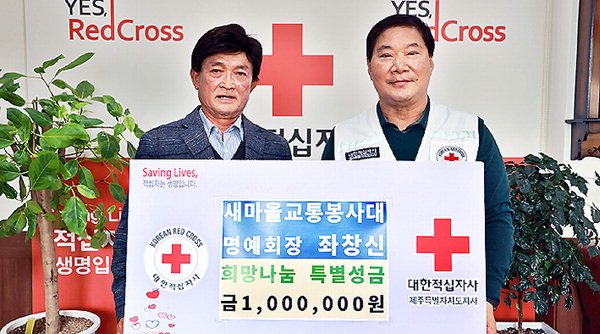 [한라일보] 새마을교통봉사대 좌창신 명예회장은 지역사회 나눔 실천의 일환으로 대한적십자사제주특별자치도지사(회장 정태근)에 희망나눔 특별성금 100만원을 기탁했다.