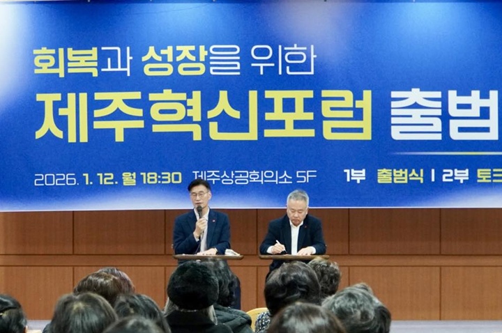 문 의원과 송 전의원은 12일 오후 제주상의 5층 대회의실에서 '회복과 성장을 위한 제주혁신포럼' 출범식을 겸한 토크콘서트를 열고 본격적인 활동에 들어간다고 밝혔다.