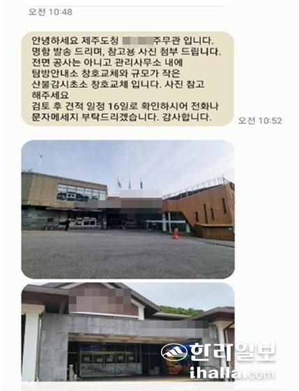 제주도는 공공기관 계약 절차상 공무원이 개인 명의로 문자 메시지를 보내 견적을 요청하거나 선납·대납을 요구하는 일은 없다고 했다. 특히 모든 공사·물품 계약은 정해진 행정 절차와 공식 공문을 통해서만 진행되고 있다고 강조했다.