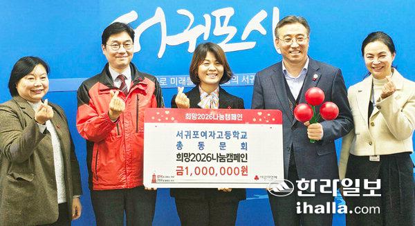 [한라일보] 서귀포여자고등학교 총동문회(회장 양경림)는 지난 16일 서귀포시청을 방문해 겨울철 어려운 이웃들을 위한 성금 100만원을 제주사회복지공동모금회에 기탁했다.