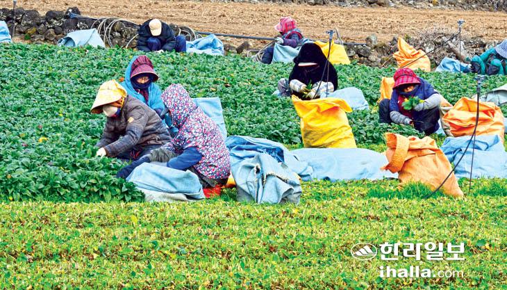 [한라일보] 20일 제주시 애월읍 하가리 한 농경지에서 농민들이 취나물 수확 작업을 하고 있다. 강희만기자