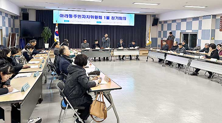 제주시 아라동주민자치위원회(위원장 양광수)는 지난 20일 주민센터 회의실에서 1월 정기회의를 개최했다.