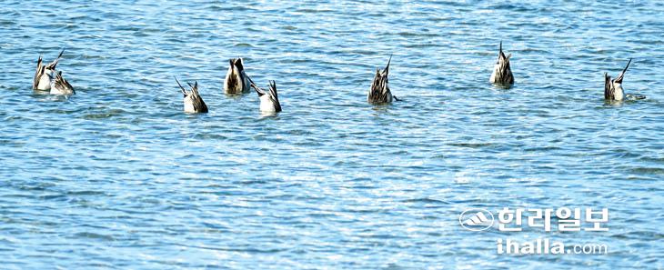 [한라일보] 27일 제주시 한경면 금등리 해안에서 고방오리들이 머리를 물속에 넣어 먹이를 찾고 있다. 강희만기자