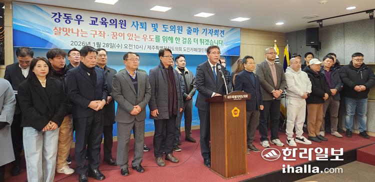 [한라일보] 현직인 강동우 교육의원(제주시 동부)이 의원직을 전격 사퇴하고 더불어민주당 소속으로 구좌읍·우도면 지역구 도의원 선거 출마를 공식 선언했다.