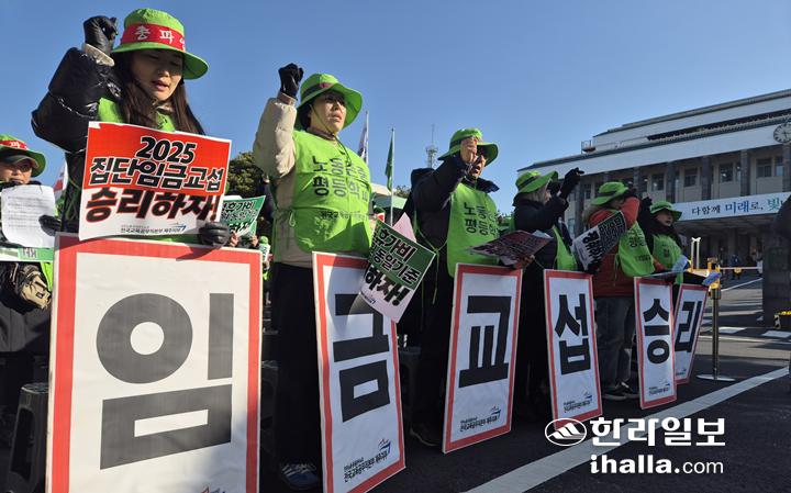 또 "정률제에 응답하는 교육청의 변화가 교섭의 돌파구가 될 수 있다"며 "설 전까지 정률제를 포함한 집단임금교섭이 타결되지 않을 경우 신학기 총파업에 돌입할 수밖에 없다"고 경고했다.