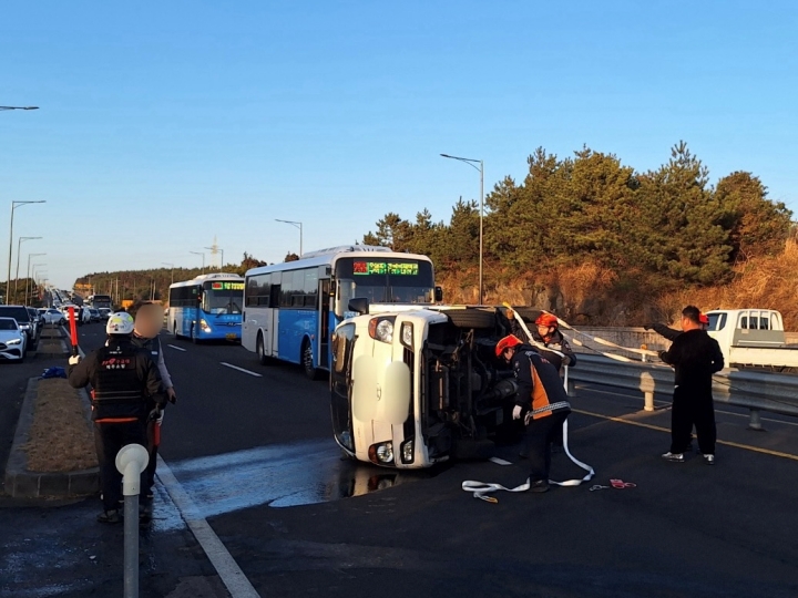 28일 제주소방안전본부에 따르면 이날 오후 4시 51분쯤 서귀포시 안덕면 광평리 평화로에서 1t 트럭이 전도됐다는 신고가 접수됐다.