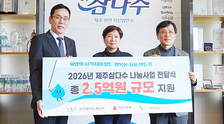 제주도개발공사와 제주사회복지공동모금회, 제주사회적경제네트워크는 지역과의 상생을 위한 '2026 제주삼다수 나눔 사업' 전달식을 지난 27일 진행했다.