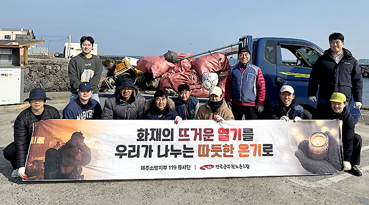 전국공무원노동조합 소방본부 제주지부는 지난 29일 신촌포구 해안가 일대에서 환경 정화 활동인 해안 플로깅(Plogging) 행사를 진행했니다.