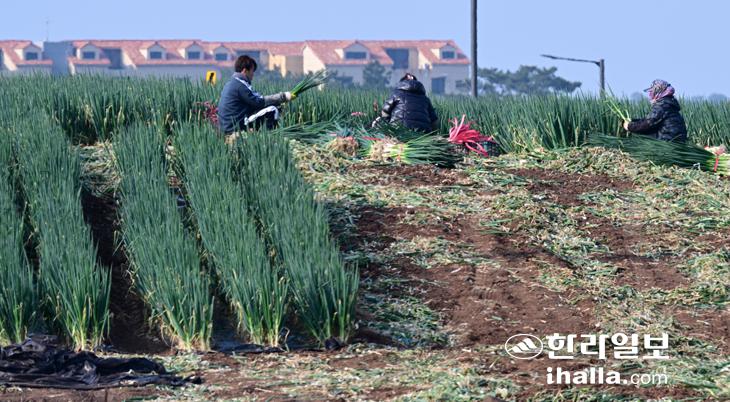 [한라일보] 29일 제주시 애월읍 하귀리 한 농경지에서 농민들이 푸릇푸릇 자라난 대파를 수확하고 있다. 강희만기자