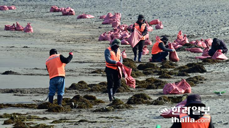 [한라일보] 29일 제주시 이호해수욕장에서 바다환경지킴이들이 파도에 밀려온 해초 등을 수거하고 있다. 강희만기자