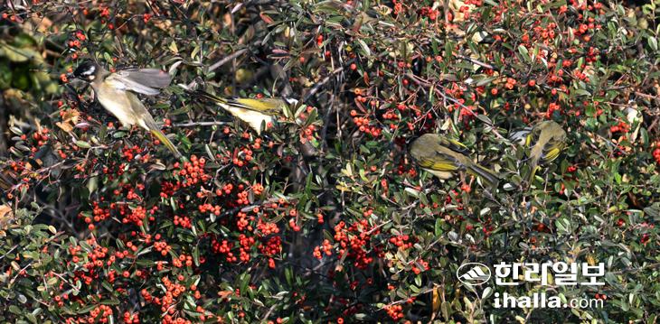 [한라일보] 29일 제주시 오라동 병문천에 배고픈 검은이마직박구리들이 피라칸타열매로 만찬을 즐기고 있다. 강희만기자