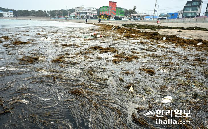[한라일보] 1일 제주시 이호테우해수욕장 백사장에 제주바다의 불청객인 괭생이모자반이 쌓여있다. 강희만기자
