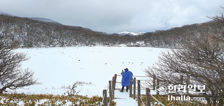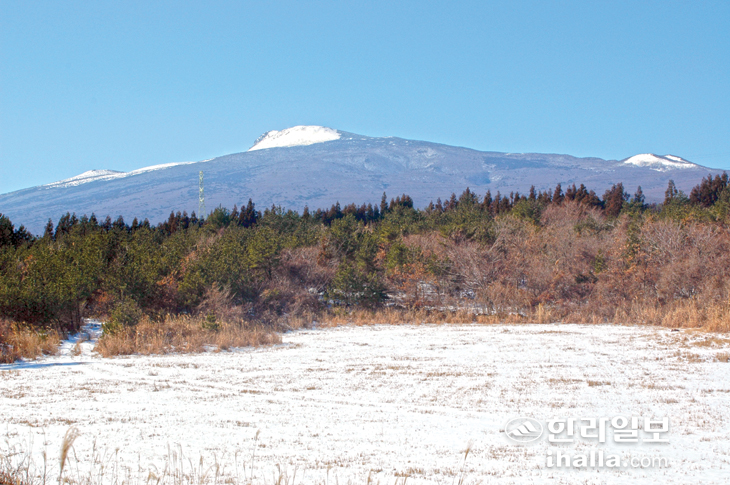 | 사라오름, 오른쪽 눈 덮인 봉우리로 멀리서도 높게 돌출해 보인다. 김찬수 |