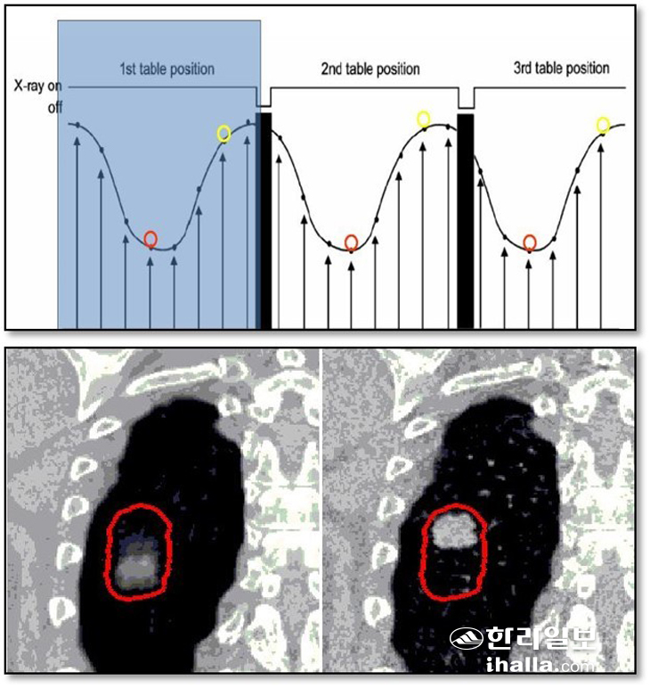호흡동조 방사선치료는 환자의 호흡으로 인한 내부 장기와 종양의 움직임을 분석해 실제 위치에 맞춰 방사선을 조사하는 치료법이다. 이를 위해 4D-CT를 시행하는데, 전체 호흡주기를 8~10단계로 나눠 촬영함으로써 환자가 자연스럽게 호흡하는 상태에서 장기 움직임을 파악할 수 있다.
