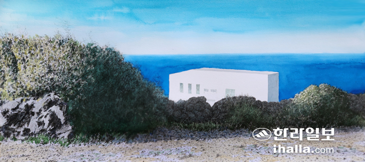 두 개의 현실적 상황이 대립해 서로를 이기려 하고 있다. 명암법과 색채대비의 싸움. 밭에서 펼쳐지는 명암은 늦은 오후 눈부신 햇살을 엄청난 광선 강도로 드러내면서 기선을 잡으려 하지만 짙은 파란색 바다는 너무도 잔잔하고 여유롭게 앞에 하얀 집 하나를 품어 명암법을 이겨버리고 만다. 회화적 입장에서 이런 구도와 상황이 발생하기는 쉽지 않다. 수평선이 소실점이라고 한다면 3층 이상 되는 건물이 밭 아래 보이는 경우 바다와 밭 흙 사이에 건물이 끼어 있게 된다. 신엄리의 자연환경의 시각적 특수성을 이해할 수 있는 너무도 명쾌한 지점을 찾아서 기쁜 마음으로 그렸다. 분명 바닷가와 인접한 곳에 서있는 하얀 건물이다. 저기 밭담을 넘더라도 경사면이 급하게 바다로 향할 것임을 직감할 수 있다. 짙푸른 바다를 이토록 넓게 향유할 수 있다는 것은 엄청난 관광 자산을 보유하고 있는 것이다. 이 밭에 단층집을 지어도 바다를 바라보는 경관은 최소 5층은 공짜로 차지하는 것이 된다. 신엄리 사람들이 묘하게 부러워서 그린 것이다. 밭담 앞과 곳곳에 겨울 배추를 수확하다 남은 잎사귀들이 뒹굴고 있다. 입춘도 지나고 겨울 배추도 떠나버린 밭. 저 바다와 함께 성급하게 봄을 노래하고 있다.