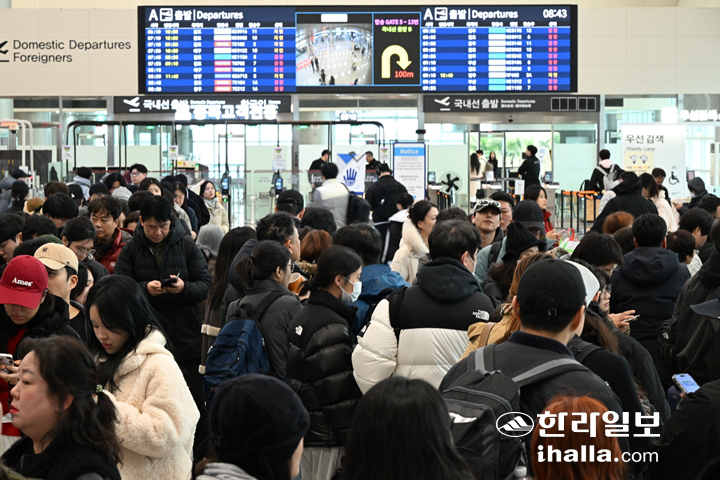 | 8일 제주공항에 많은 눈이 내리면서 제설작업으로 공항이 폐쇄되자 출발대합실이 크게 붐비고 있다. 강희만 기자 |