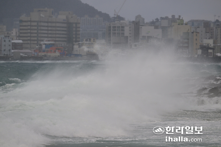 | 제주 전 해상에 풍랑특보가 발효된 8일 제주시 해안가에 강한 파도가 몰아치고 있다. 강희만기자 |