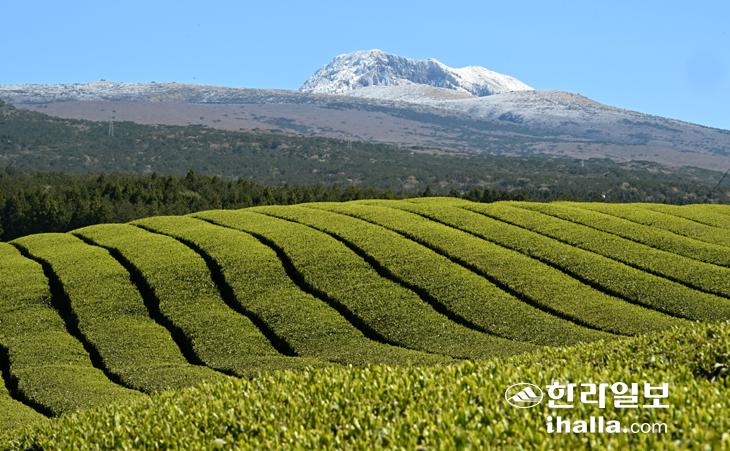 봄 기운이 완연한 녹차밭과 한라산에 남은 잔설. 한라일보DB