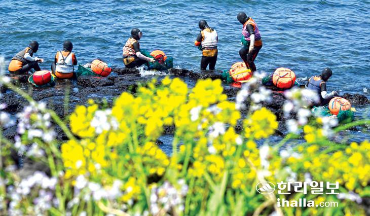 활짝 핀 유채꽃과 물질나서는 제주해녀. 한라일보DB