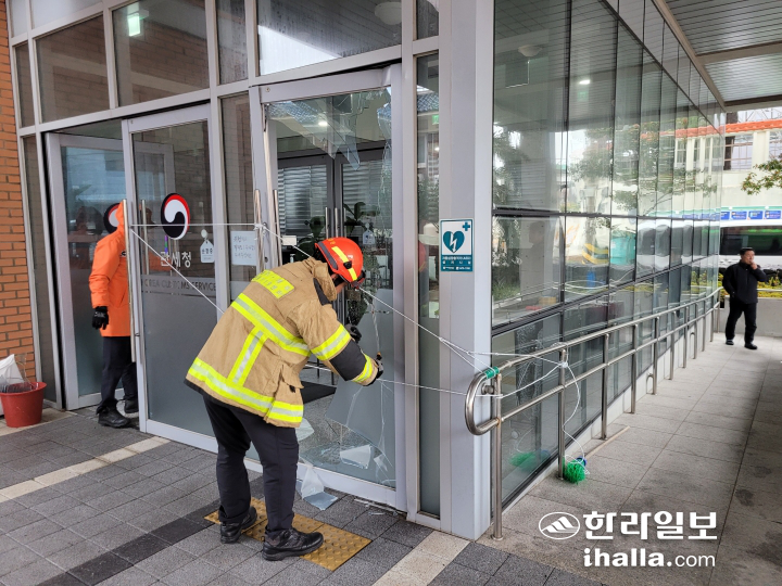 | 2일 오후 2시 42분에 연동에서는 강풍으로 한 건물의 현관문 유리가 파손됐다. 제주소방안전본부 제공 |