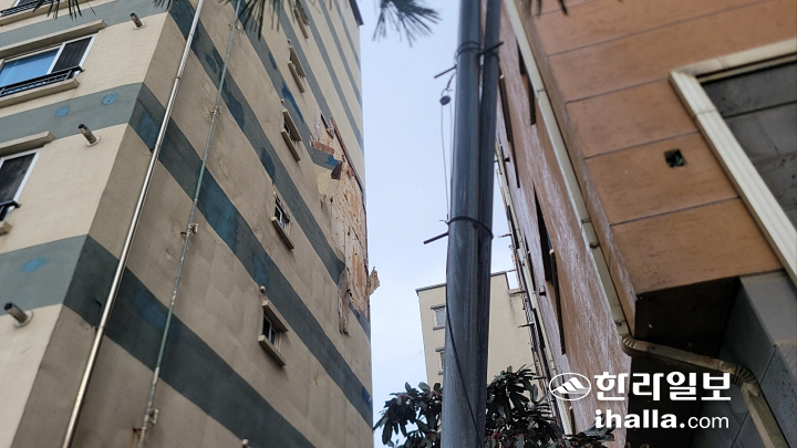 | 2일 오후 4시 19분쯤 제주시 외도1동의 한 건물 외벽에 있던 외장재가 강풍에 의해 떨어졌다. 제주소방안전본부 제공 |