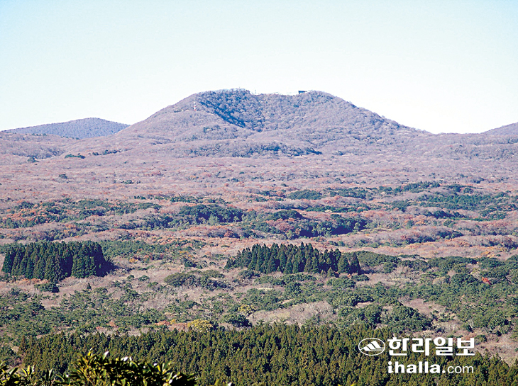 | 물오름. 정상에 제주항공무선표지소 시설이 보이고, 분화구가 골짜기를 형성한다. 김찬수 |
