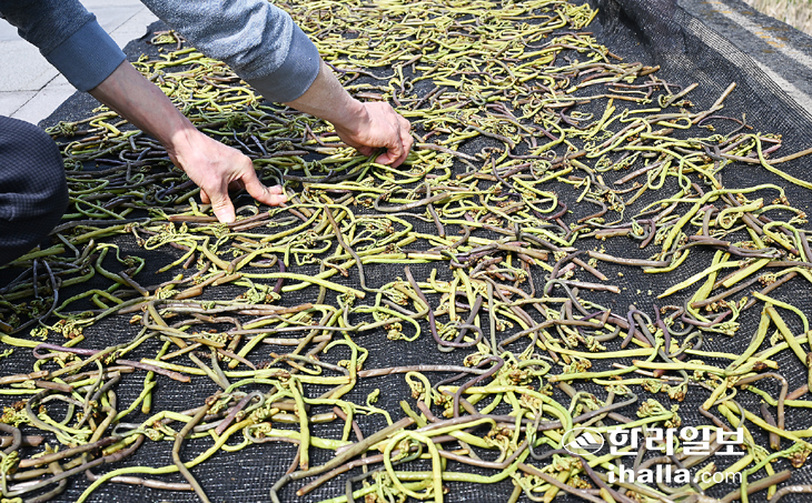 | 제주시 용담동 해안도로변에서 한 주민이 갓 꺾은 햇고사리를 봄볕과 해풍에 말리는 모습. /사진=한라일보DB |
