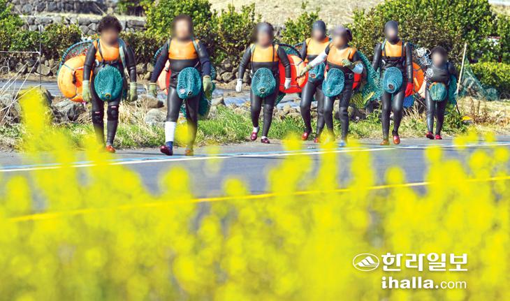 [한라일보] 14일 서귀포시 대정읍 해녀들이 물질을 위해 유채꽃이 만발한 해안도로를 걸어가고 있다. 강희만기자