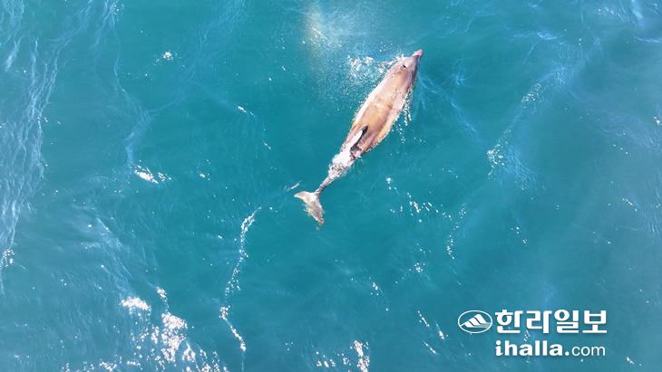 [한라일보] 지난해 12월 23일 폐어구에 감겨 등지느러미가 잘린 채 발견됐던 제주 새끼 남방큰돌고래 '쌘돌이'. 발견 87일 만에 폐어구에서 벗어나 자유롭게 유영하는 모습이 확인됐다.